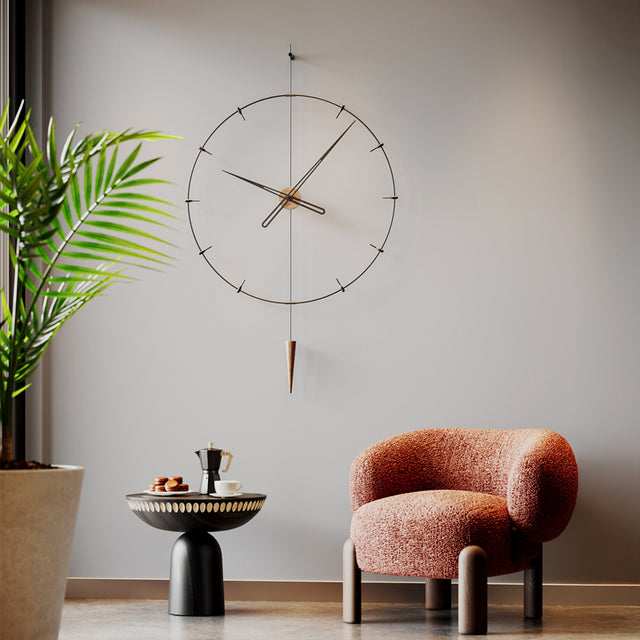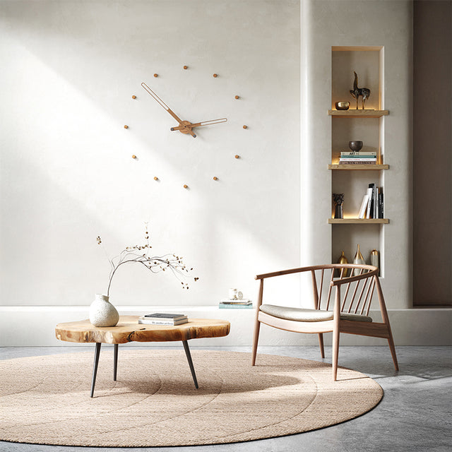 Our clocks combine natural, durable materials such as solid wood and stainless steel with refined PVD-coated and fiberglass details. The silent German quartz movement with high torque meets a clean, sculptural form — creating a subtle yet striking focal point on the wall.